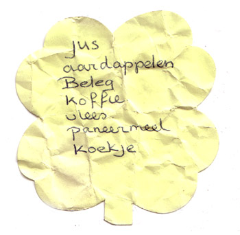 Gevonden: een boodschappenlijstje. Op een klein geel klavertjevier-vormig papiertje. Met helemaal onderaan het uiterst vertederende ‘koekje’. Ook Binnenlanders kunnen zo af en toe je hart doen smelten, zo blijkt, dus ik deel dit graag even met u.